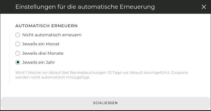 Bitte beachten Sie, dass der automatische Verlängerungszeitraum unabhängig von manuellen Verlängerungen ist. Wenn Sie zum Beispiel für ein Jahr erneuern und Ihr automatischer Verlängerungszeitraum der Monat ist, werden Sie um einen Monat verlängert, wenn die einjährige Mitgliedschaft abläuft.