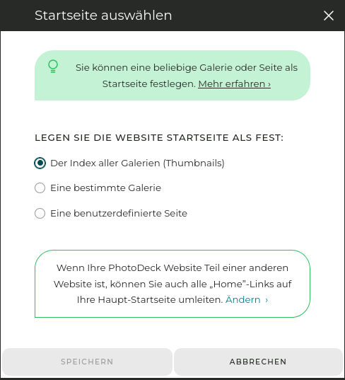 Wenn Sie Ihre Galerien nach Kategorien geordnet haben (z. B. „Portfolio”, „Archiv”, …), können Sie auch die wichtigste Galerie/Kategorie auf der obersten Ebene als Startseite einrichten. Der Index (Thumbnails) der Untergalerien wird dann angezeigt. - Eine benutzerdefinierte Seite, wenn Sie eine freie Seite auf Ihrer Startseite bevorzugen, zum Beispiel mit einer ganzseitigen Slideshow im Hintergrund (siehe Anleitung unten). Sie können eine andere Startseite für Ihre Website für Smartphones auswählen.