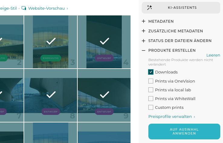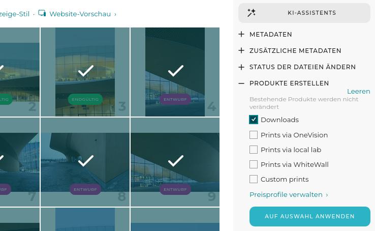 Sobald Ihr Preisprofil definiert ist, gehen Sie zu Meine Bilder & Videos, wählen Sie die Bilder aus, die Sie unter diesem Preisprofil verkaufen möchten, und fügen Sie das neue Preisprofil auf der rechten Seite diesen Bildern zu.