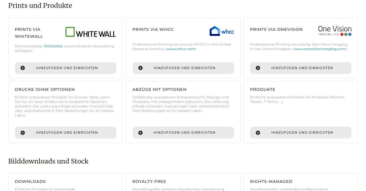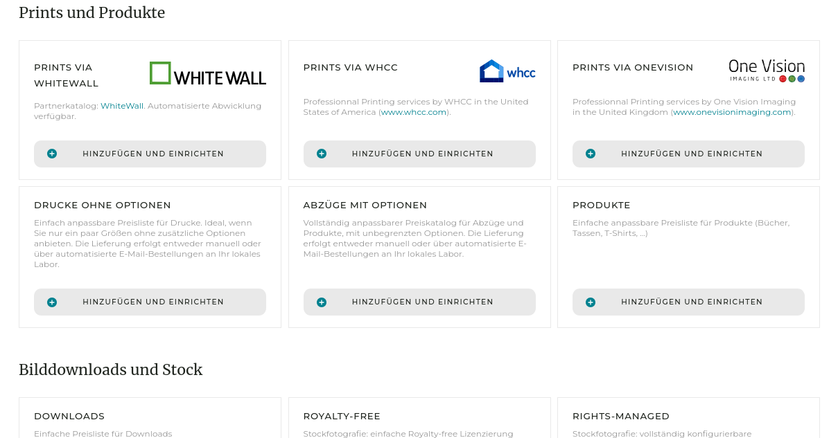 Es gibt mehrere Preisprofilvorlagen für den Verkauf von Downloads, Abzügen, Stockfotografien, Videos und Dokumenten, die alle stark individualisiert werden können.