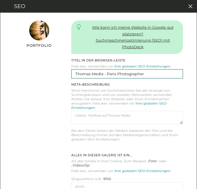 Wie der Titel wird auch die Meta-Beschreibung automatisch auf der Grundlage Ihrer globalen Einstellungen für die Suchmaschinenoptimierung (SEO) generiert, und Sie können eine individualisierte Beschreibung für einzelne Galerien und benutzerdefinierte Seiten über deren Einstellungen festlegen.