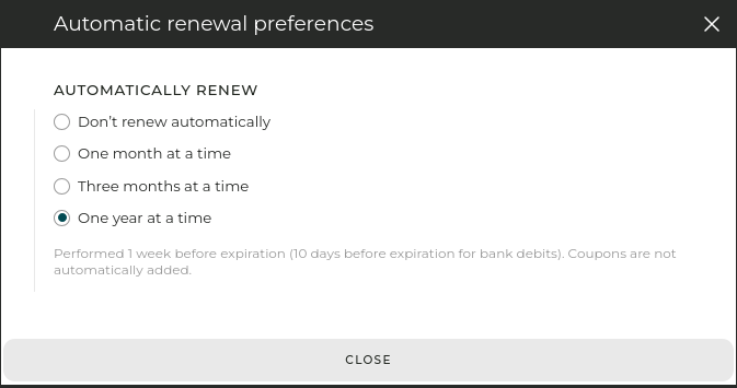You can make your life a little easier by setting up auto-renewal. When auto-renewal is enabled under Avatar / Subscription & add-ons / Automatic renewal preferences, a payment debit is made 1 week before the expiry of your last subscription, and it also includes other subscriptions (e.g. add-ons) set to expire before the end of the new subscription. You can cancel auto-renewal at any time from this section as well.