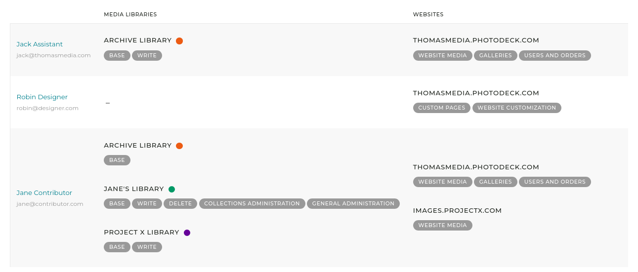 - Creates with the PhotoDeck administrator the photographer’s team-member account if they don’t have one already, and provides them with the BASE, WRITE and DELETE rights to the media library (no rights on the website).