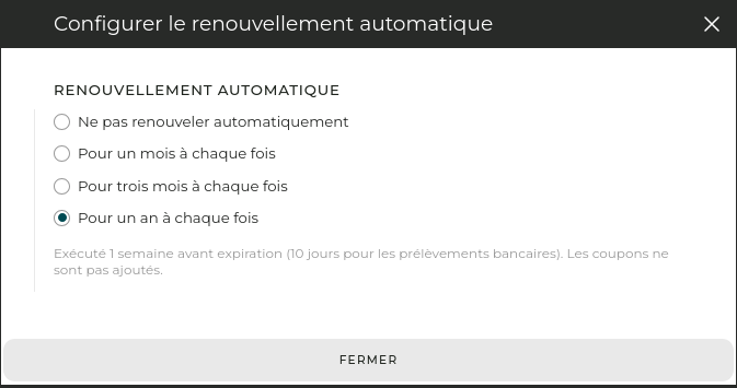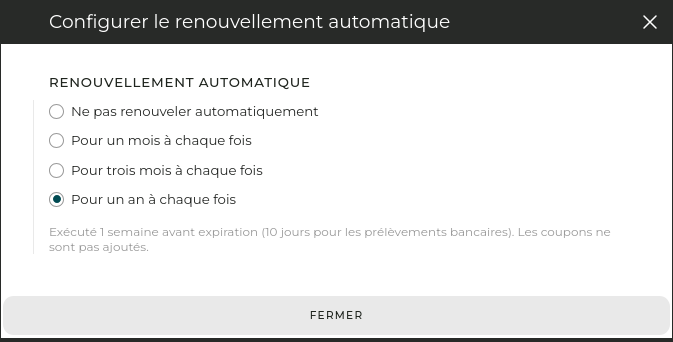 Notez que la période de renouvellement automatique est indépendante des renouvellements manuels. Par exemple, si vous renouvelez pour un an et que votre période de renouvellement automatique est le mois, vous serez renouvelé pour un mois à l’expiration de l’abonnement d’un an.