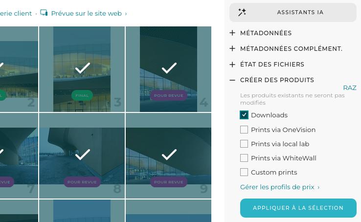 Cette section attache des profils de prix pré-définis à tous les fichiers d’une galerie. Cela automatise simplement la méthode consistant à sélectionner manuellement des fichiers pour leur attacher un profil de prix. Consultez l’aide sur les profils de prix pour plus d’information sur les profils de prix.