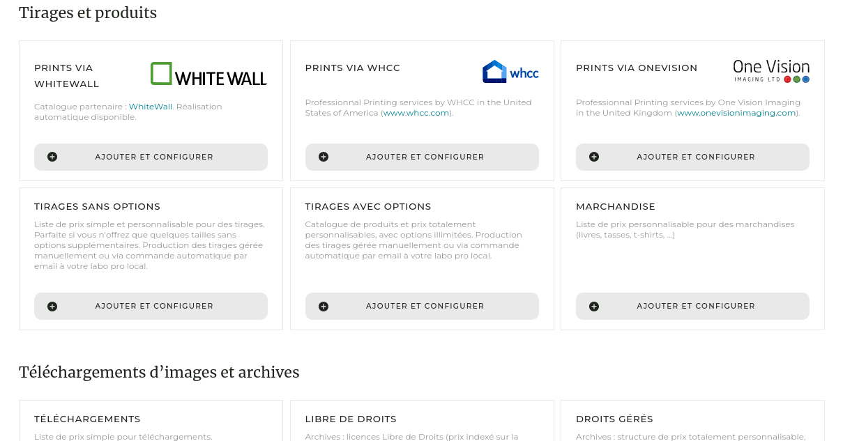 De multiples modèles de profils de prix sont disponibles, vous permettant de vendre des téléchargements, des tirages, des licences, des clips vidéos et des documents. Chaque modèle est personnalisable en profondeur.