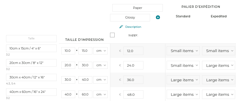 Ensuite, pour chaque option dans le Profil de Prix, vous pourrez optionnellement définir un nouveau Palier d’Envoi qui remplacera le défaut. Par exemple, si le Palier par défaut est pour de petits articles, vous pouvez indiquer que pour des tirages de grande taille, le Palier d’Envoi soit changé pour un palier supérieur.