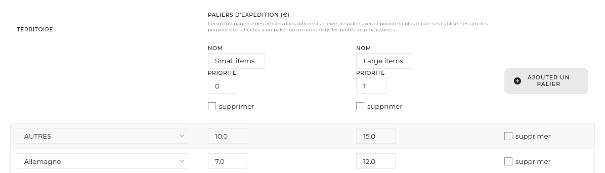 Par exemple, quand un client commande des articles dans un Palier d’Envoi “gros articles” (“large items”), ainsi que des articles dans un Palier “petits articles”, le prix d’envoi sera celui qui correspondra au Palier d’Envoi avec la plus haute priorité (normalement, ce devrait être le plus onéreux).
