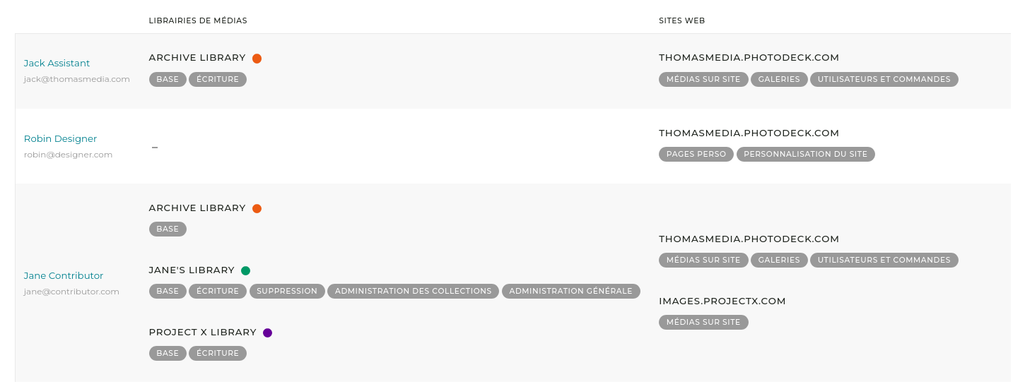 Les droits d’un co-équipier sur une librairie de médias s’appliquent à tous les fichiers de cette librairie. Dans le cas d’agences et de collectifs de photographes, il est souvent nécessaire d’avoir une ségrégation plus importante entre les fichiers de photographes différents. Cette ségrégation est effectuée en créant différentes librairies de médias.
