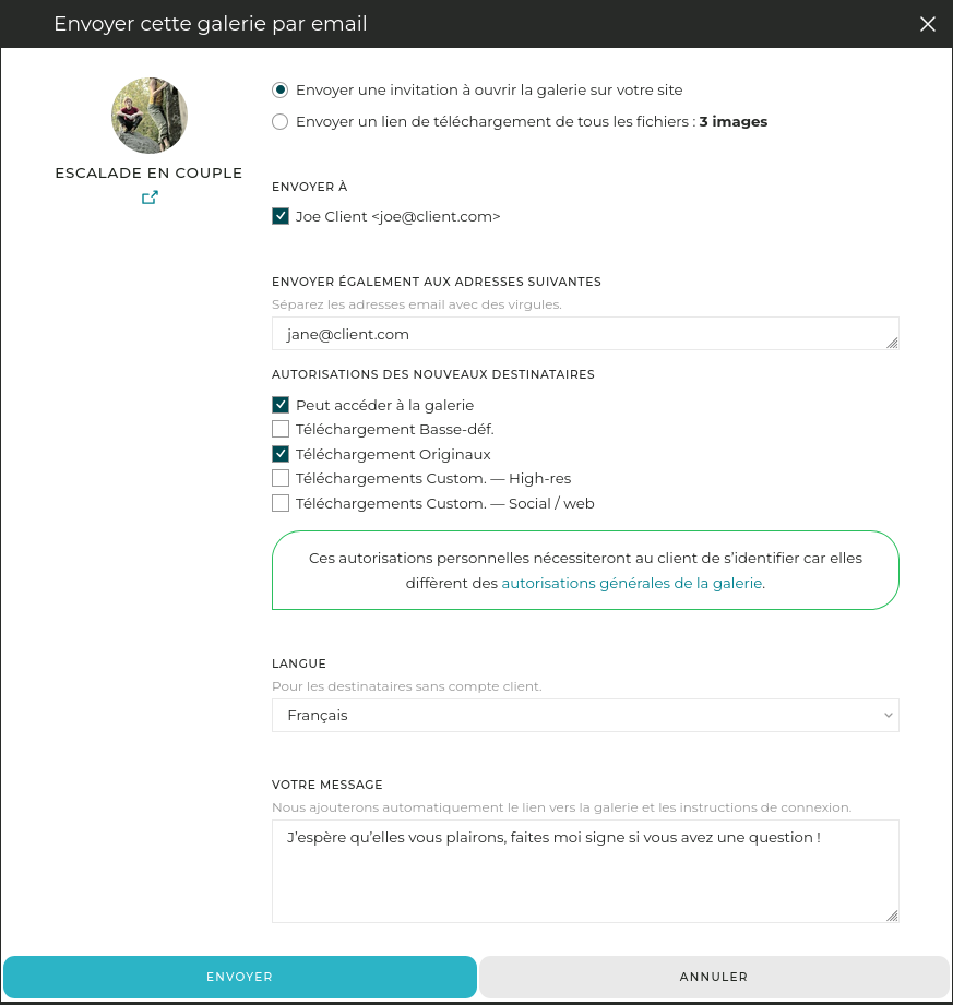 Une fois une première galerie créée, il est facile de réutiliser ses paramètres pour d’autres clients.
