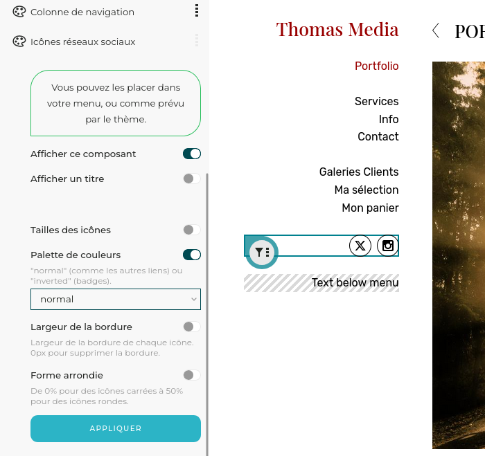 De même, un clic sur l’icône « filtre » d’un composant de votre thème (par exemple les icônes de vos réseaux sociaux) mettra en avant toutes les options de personnalisation pertinentes
