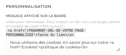 Vous pouvez facilement changer le message affiché sur la barre de consentement. Dans ce cas, le lien vers la page de politique de cookies automatiquement générée est supprimé, vous pouvez donc :